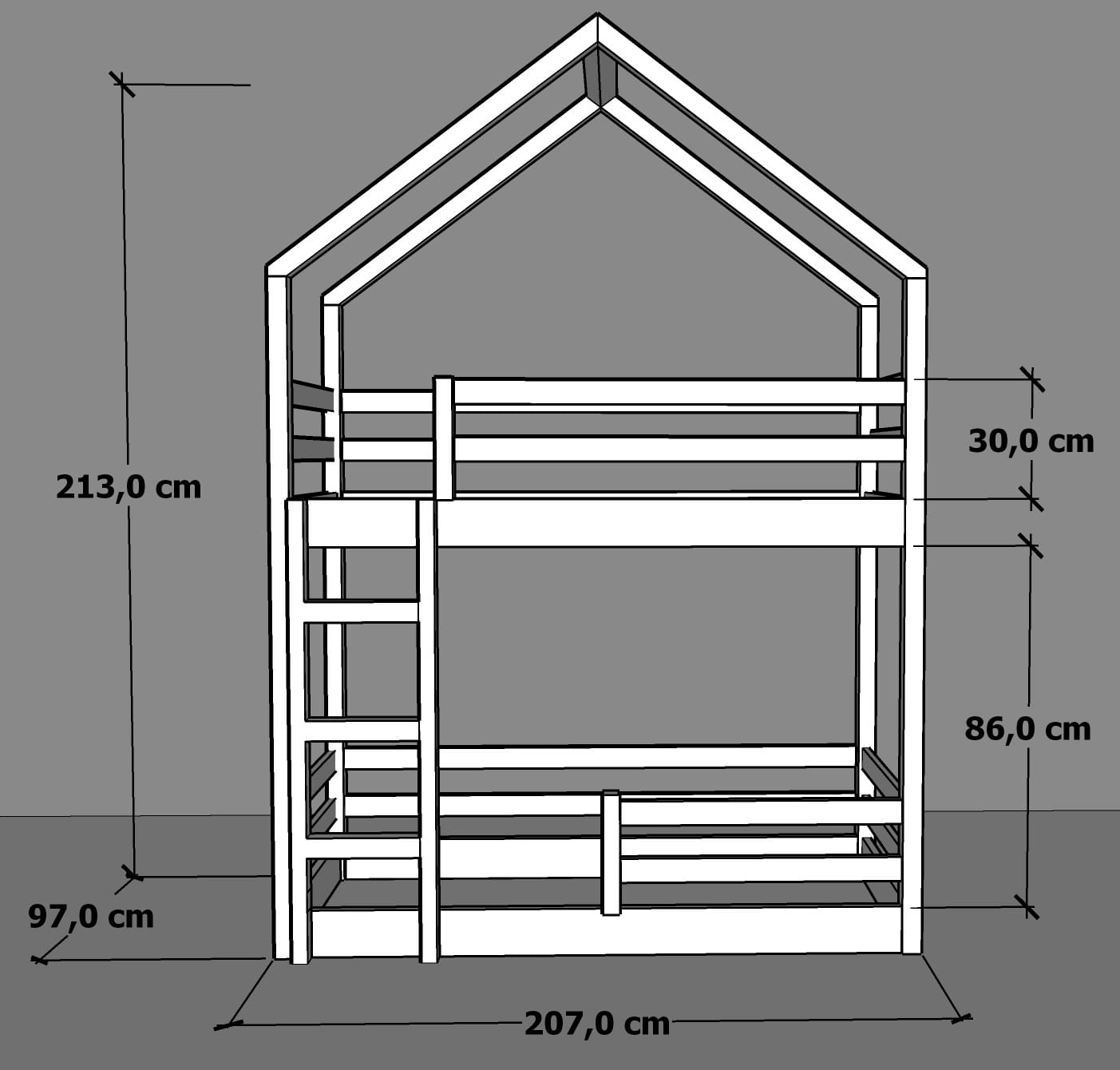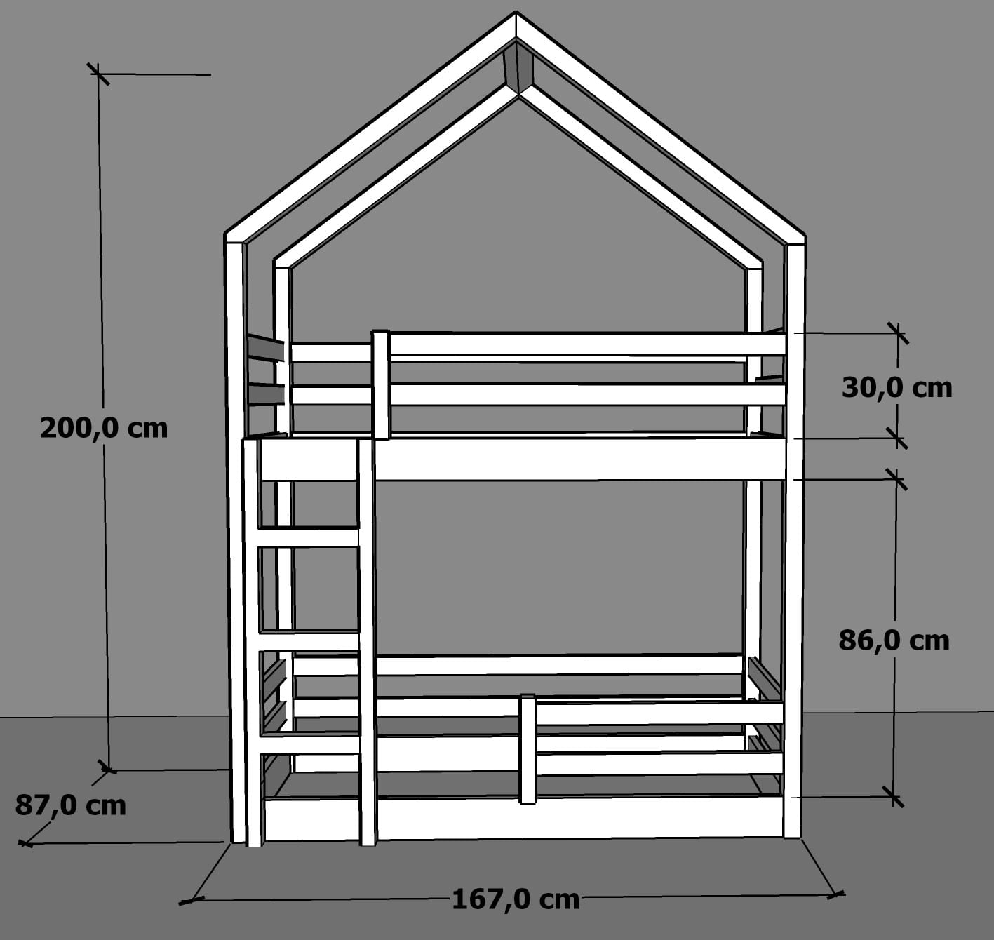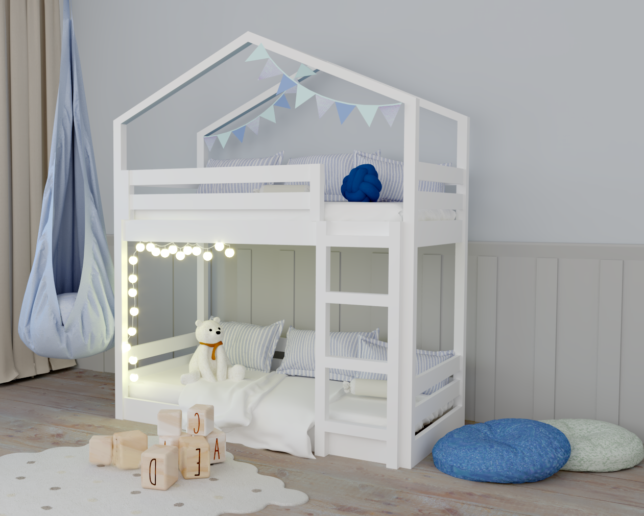 Eleganckie i proste łóżeczko piętrowe. Pomoże zaoszczędzić miejsce na ograniczonej przestrzeni, przy okazji zapewniając komfort Pociechom. Kształt domku spodoba się dzieciom, dodatkowo dając możliwość ozdobienia go według własnego pomysłu.