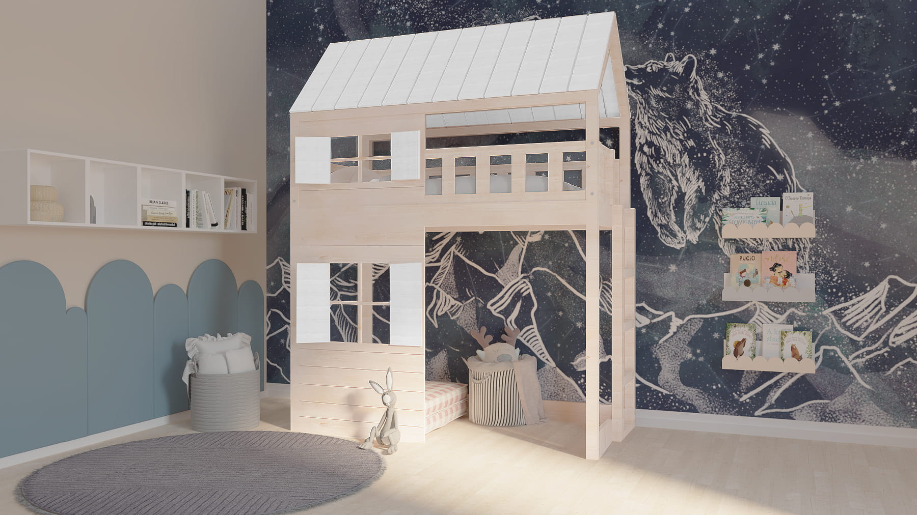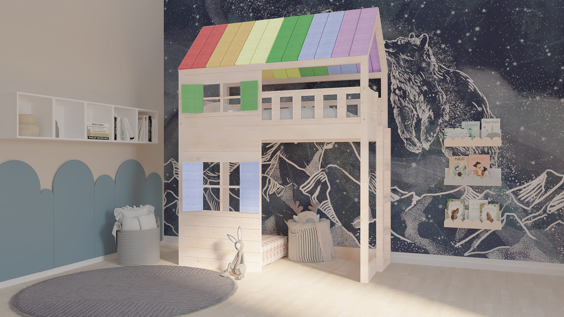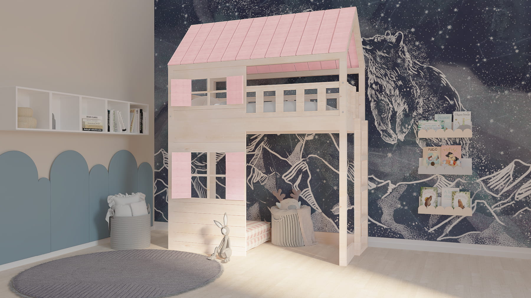 Ten uroczy drewniany mebel w zaczarowany sposób zmieni dziecięcy pokój stając się centrum wypoczynku oraz zabaw. Dzieci będą zachwycone.