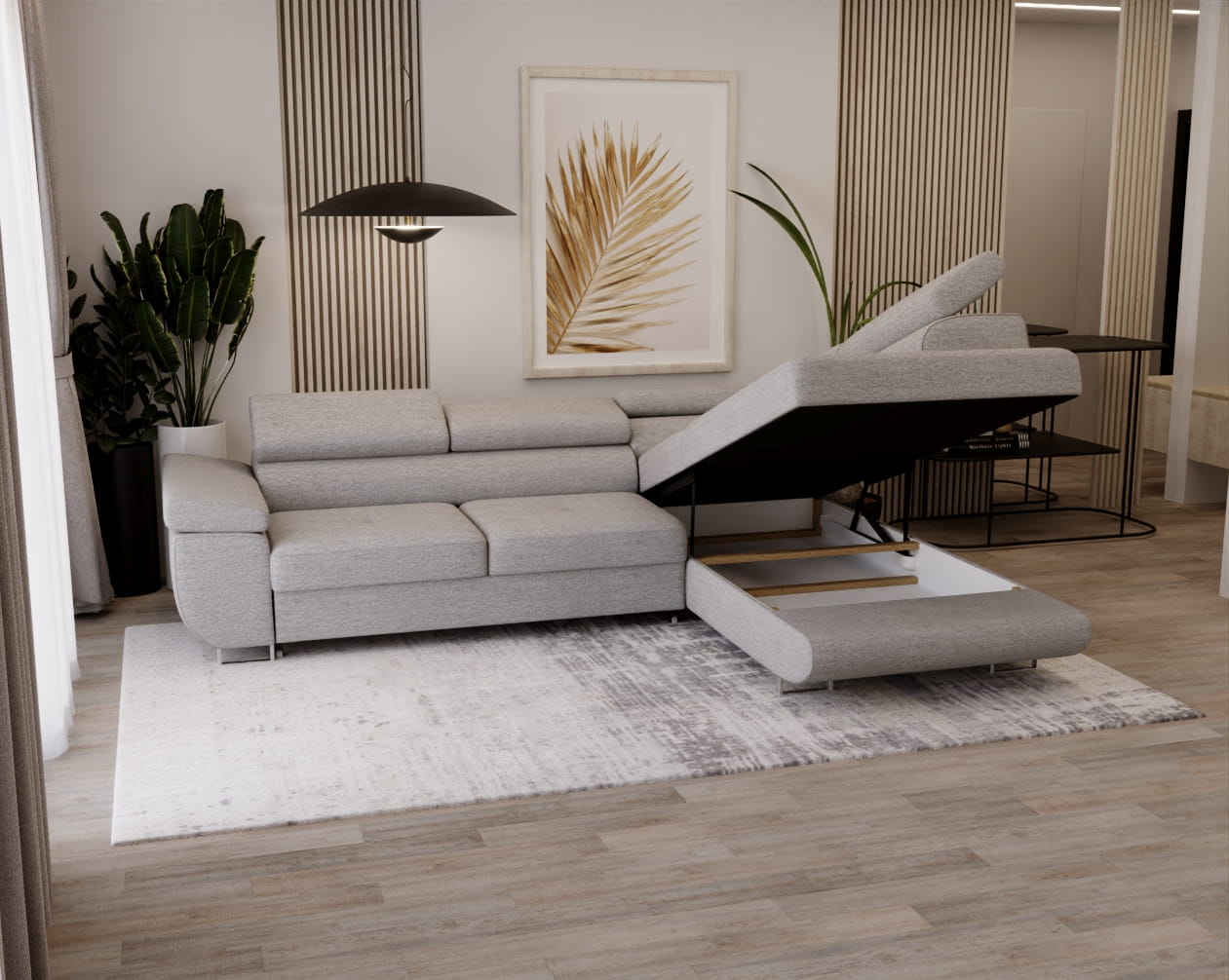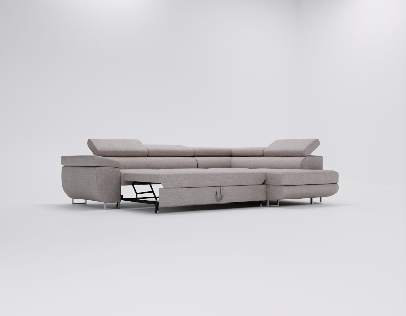 Narożnik Anton z funkcją spania, dzięki łatwemu rozkładaniu, w mgnieniu oka zmienia się w wygodne łóżko. Wystarczy chwila, by przygotować go na nocny wypoczynek. To idealne rozwiązanie w przypadku niespodziewanych gości lub na weekendowe drzemki. Warto podkreślić, że narożnik Anton nie oszczędza na komforcie, zapewniając niezwykle przyjemne siedzenie i sen. Zarówno krótka popołudniowa drzemka, jak i pełny nocny relaks, będą absolutnie wyjątkowe. Mebel został dodatkowo wyposażony w funkcjonalny pojemnik na pościel.