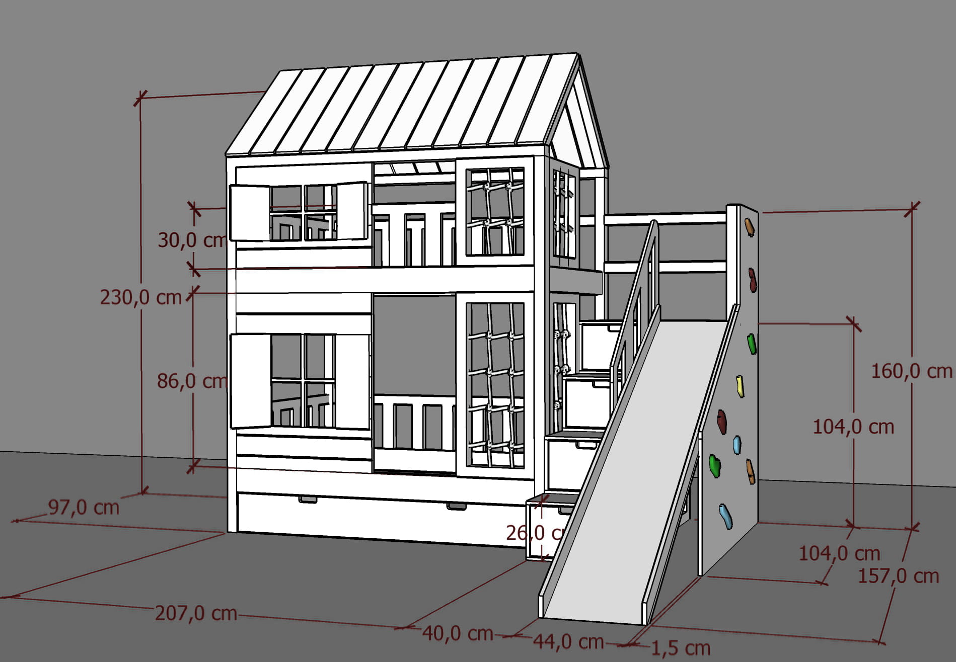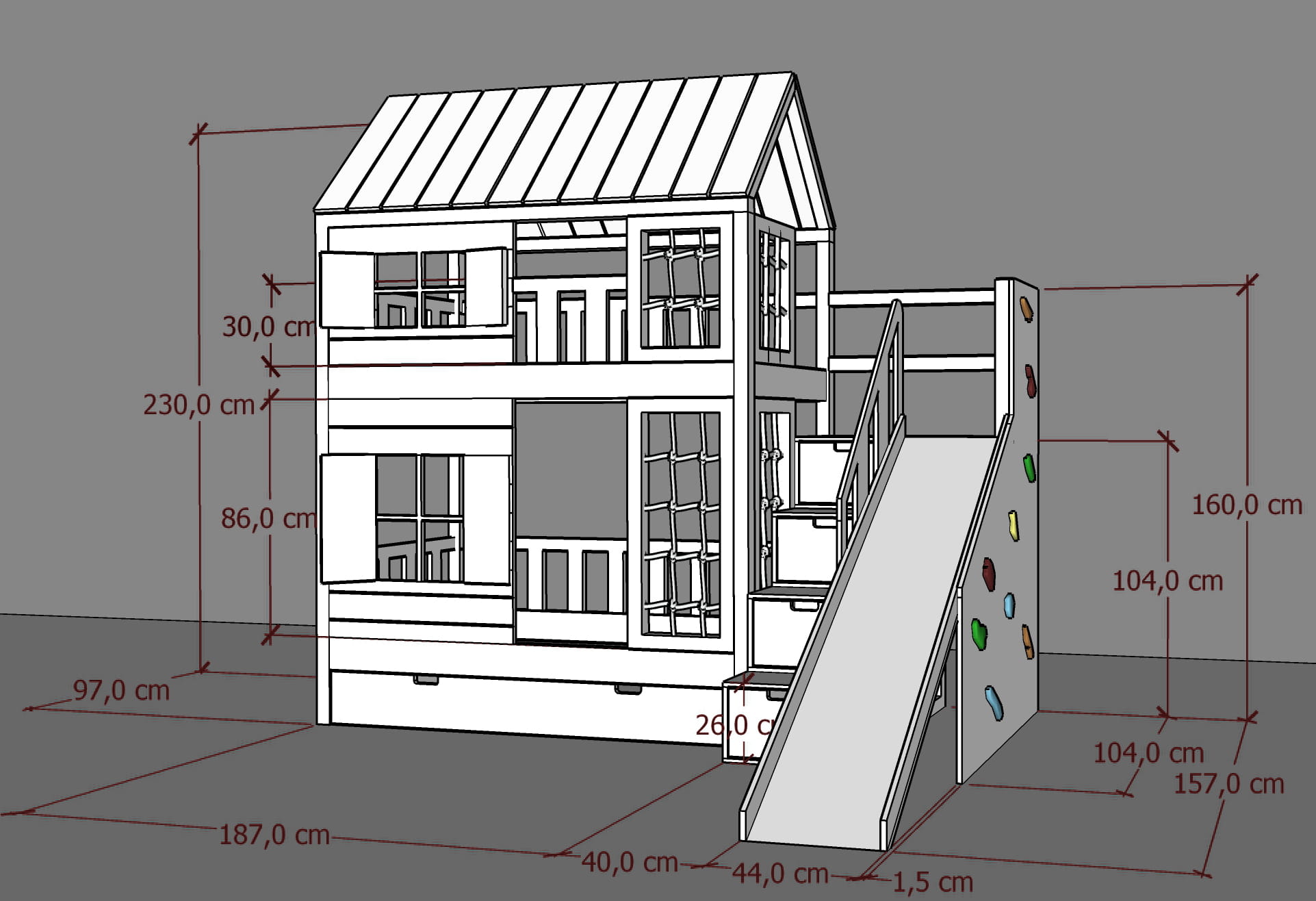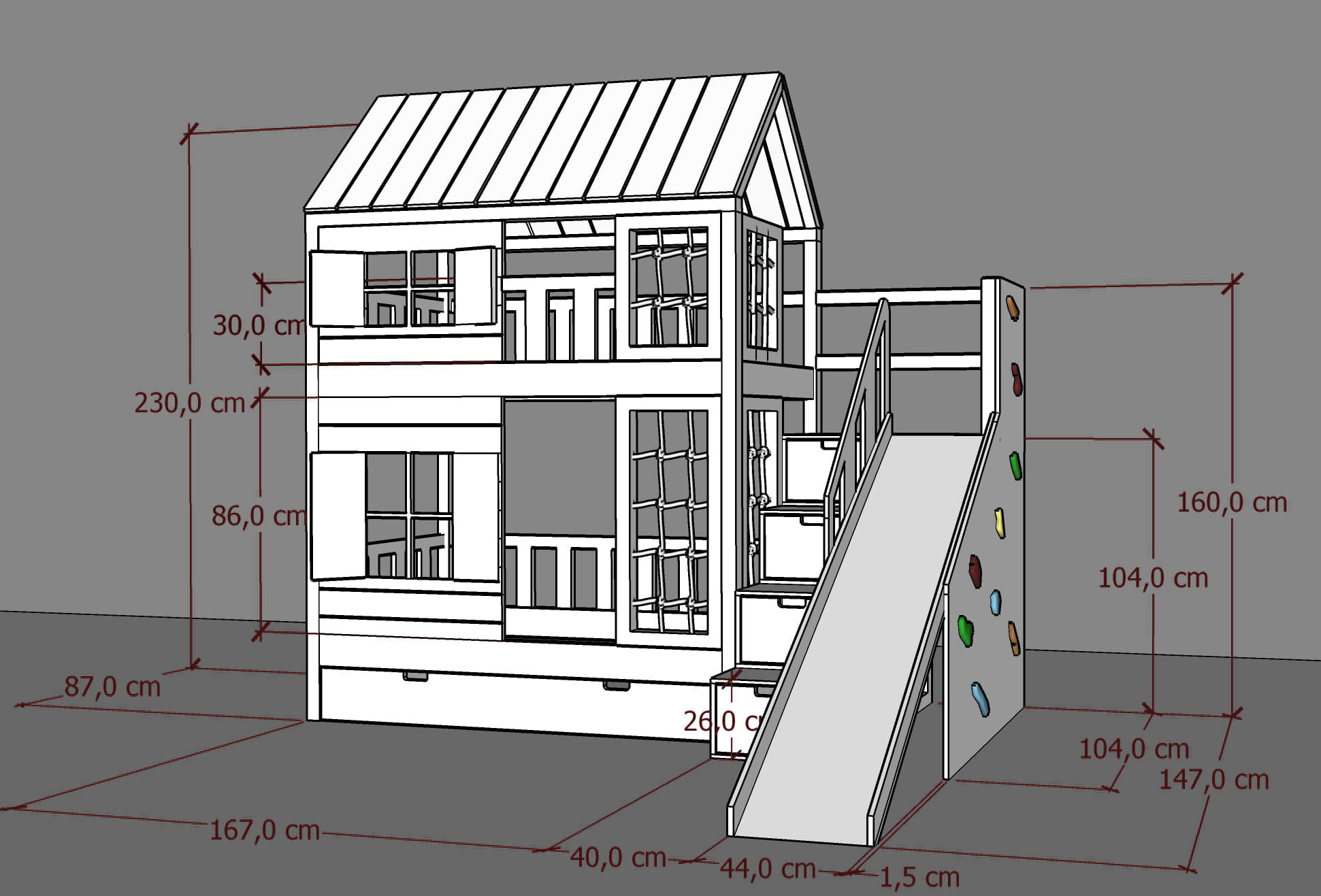 Ten uroczy mebel z drewna w zaczarowany sposób zmieni dziecięcy pokój stając się centrum wypoczynku oraz zabaw. Jest tu wszystko co potrzebne do zużycia dziecięcej energii! Wybierzcie takie malowanie Placu Zabaw jakie Wam się najbardziej podoba. Dzieci będą zachwycone.