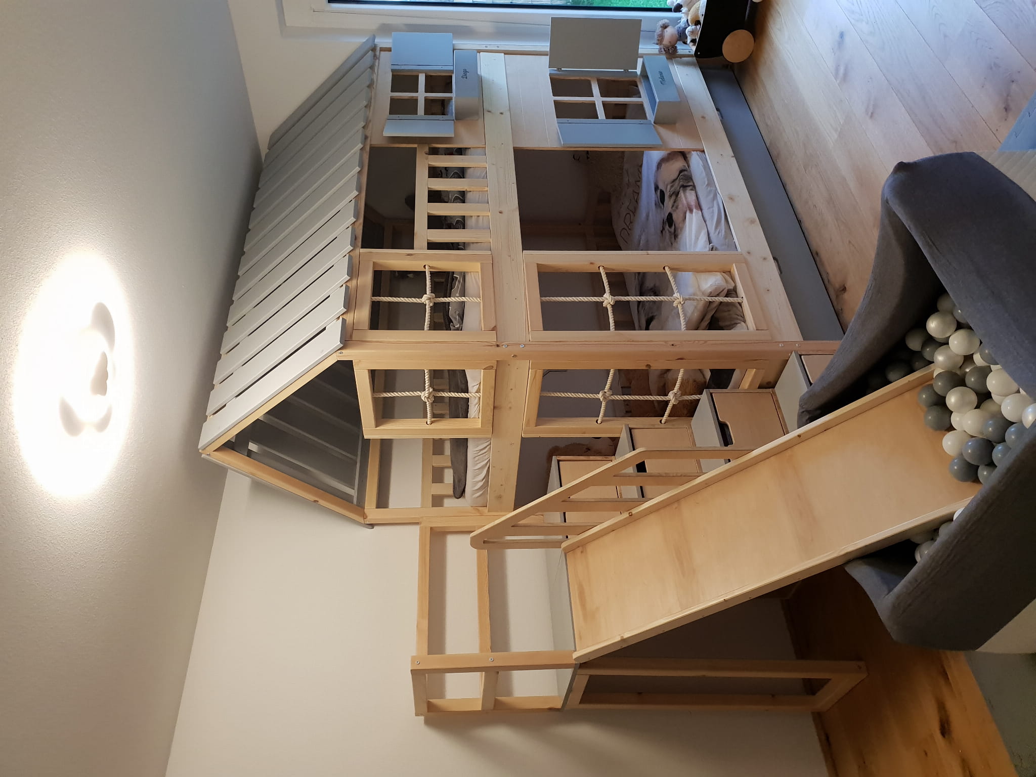 Piętrowe łóżko dziecięce ze zjeżdżalnią i ścianką wspinaczkową, z drewna sosnowego