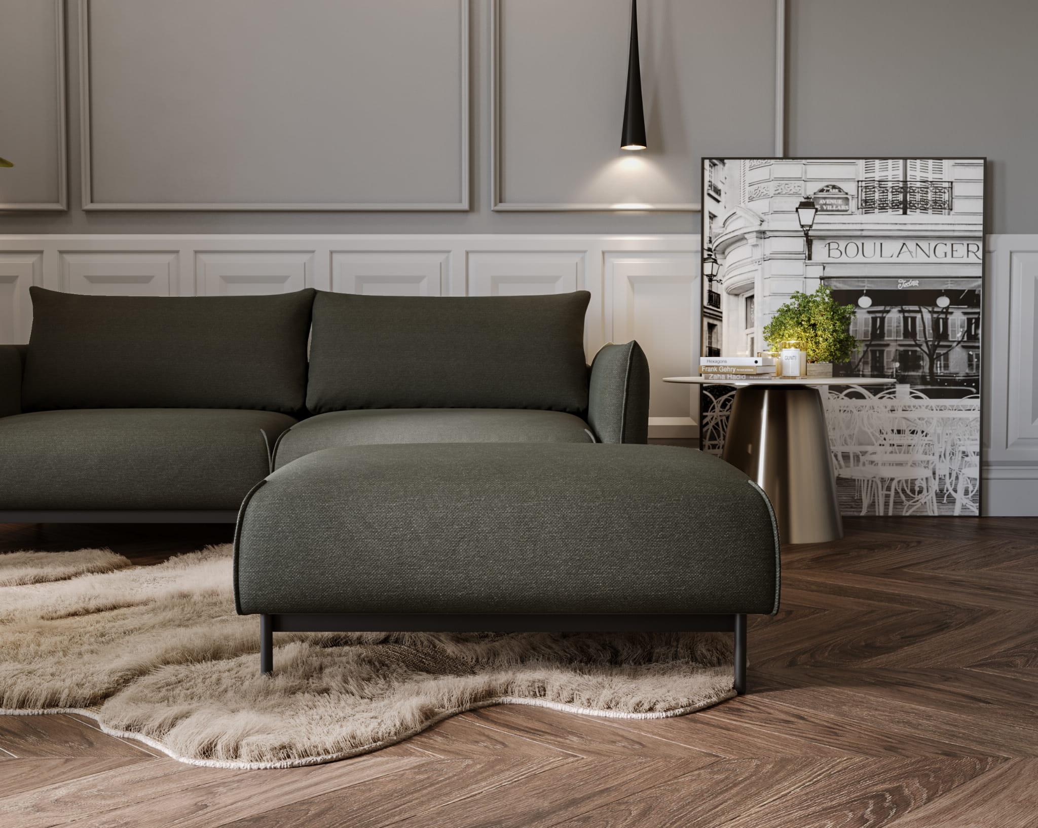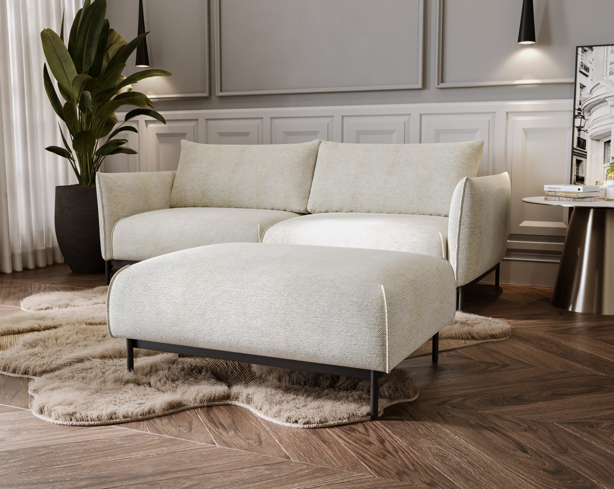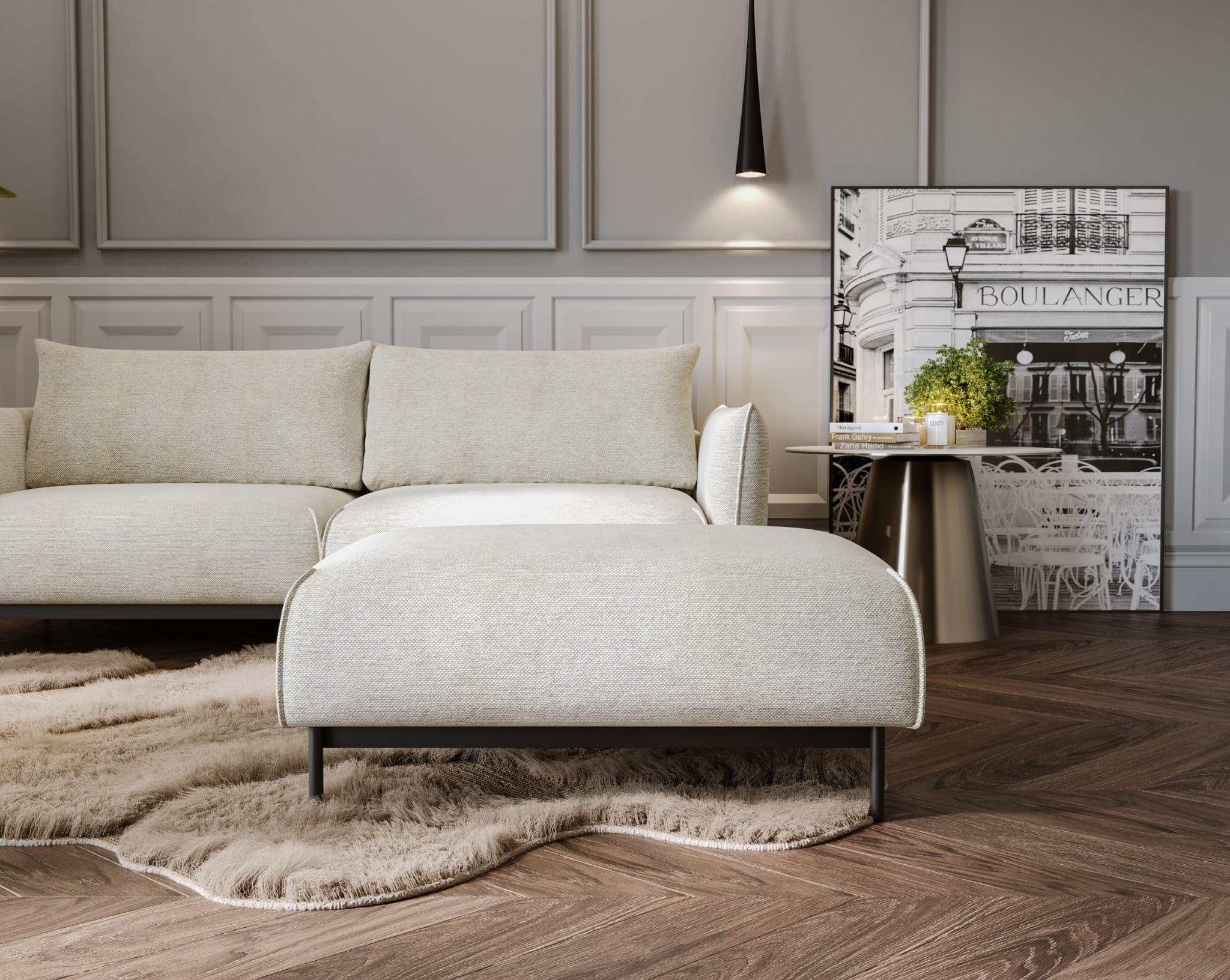 Dzięki lekko zaokrąglonym rogom i eleganckim, czarnym nóżkom z metalu, pufa Bueno prezentuje się lekko i stylowo, a jednocześnie zaskakuje stabilnością i komfortem.