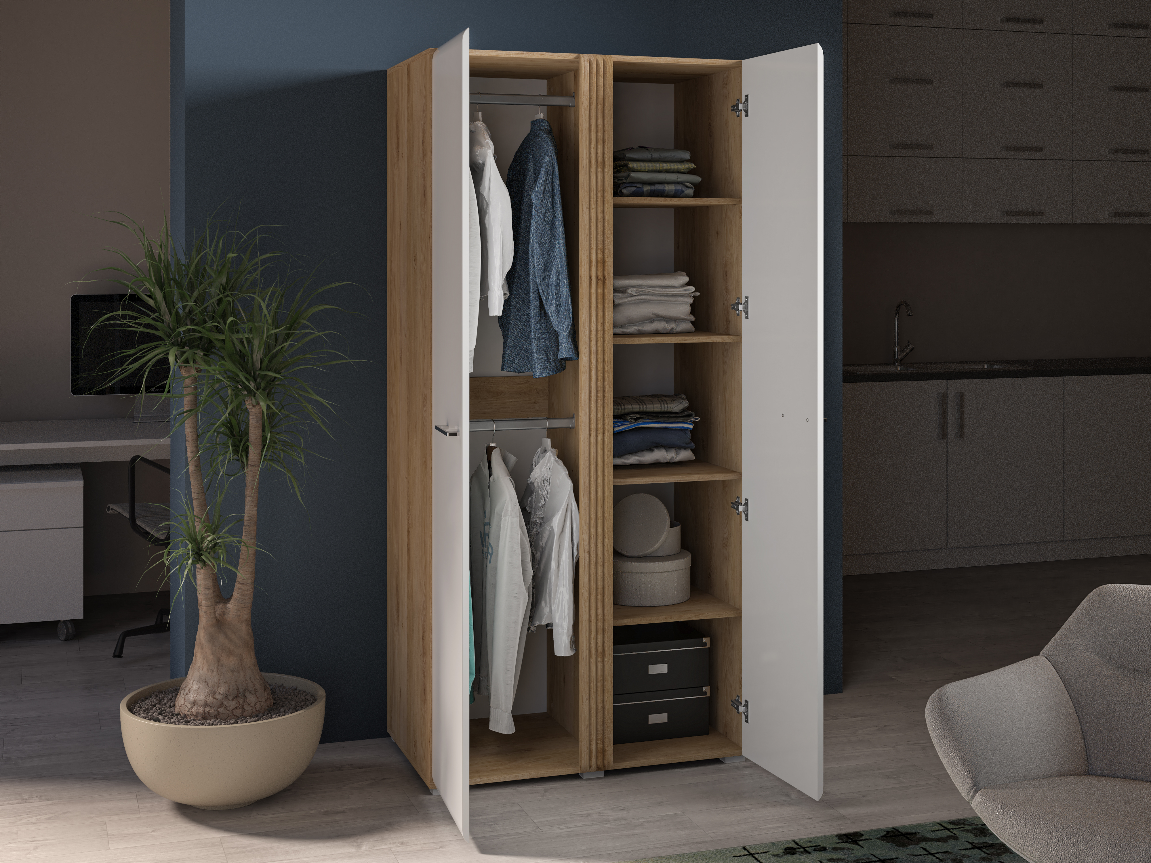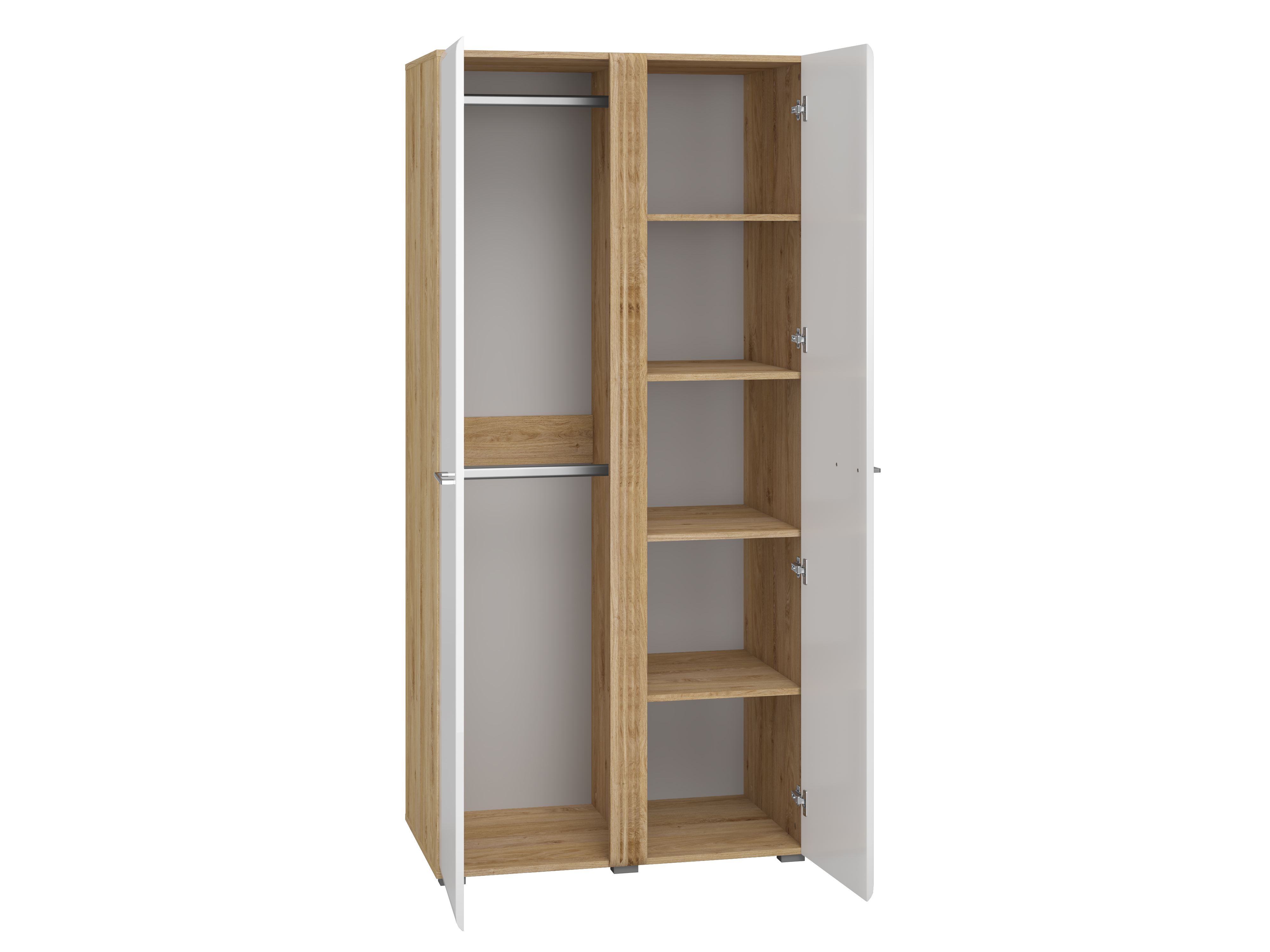 Szafa ADAGIO to wysokiej jakości mebel, który łączy nowoczesny design z subtelną nutą klasycznej elegancji. Jasne, białe fronty w zestawieniu z naturalną kolorystyką korpusu tworzą harmonijną kompozycję, idealnie dopasowującą się zarówno do wnętrz nowoczesnych, jak i bardziej tradycyjnych aranżacji.