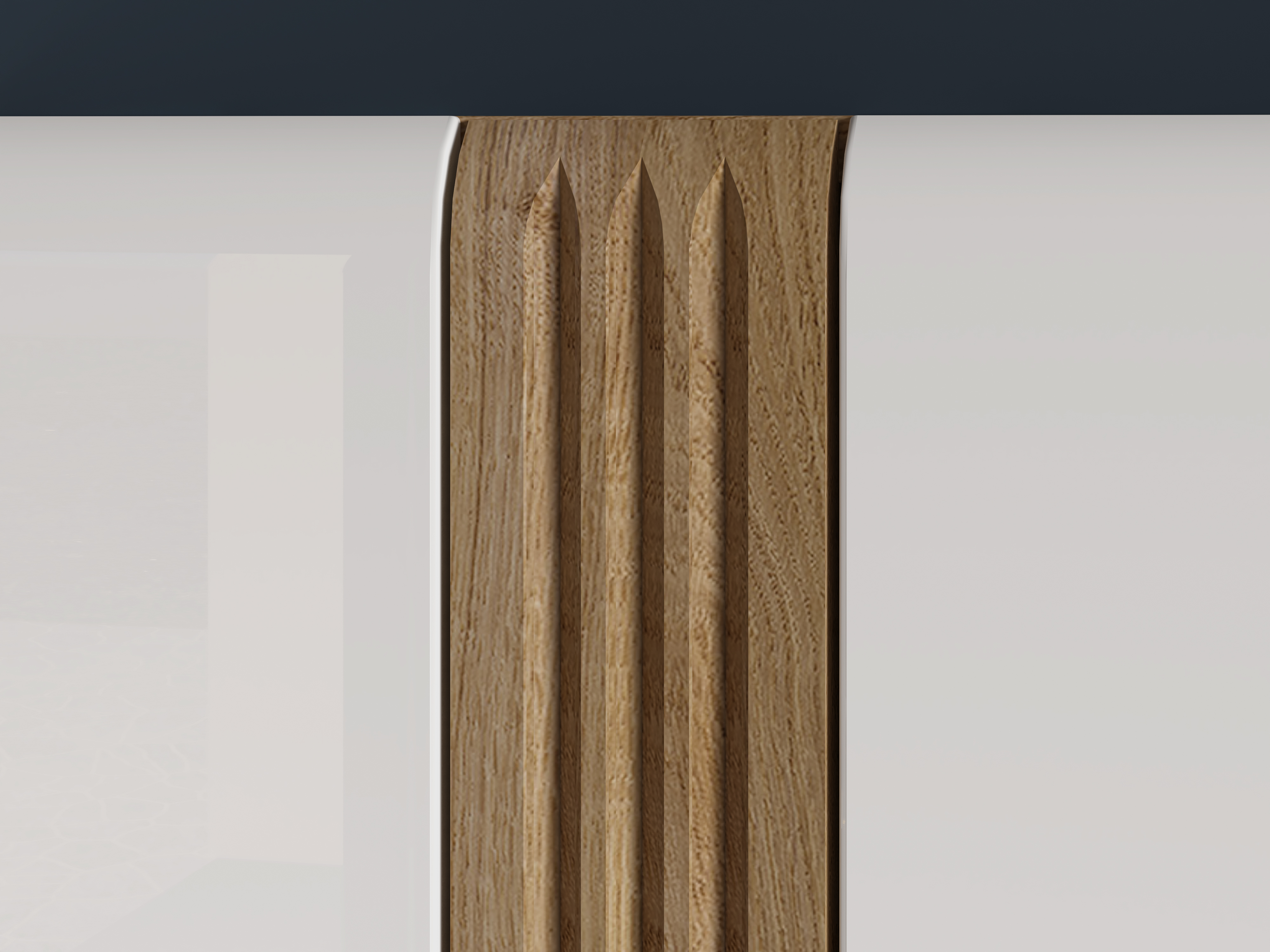 Gładkie powierzchnie mebla oraz eleganckie metalowe uchwyty skutecznie odbijają światło, co optycznie powiększa przestrzeń i nadaje wnętrzu lekkości. Ryflowane wstawki w kolorze korpusu nadają szafie unikalnego charakteru, a delikatnie zaoblone górne krawędzie frontów przełamują geometryczną linię bryły, wprowadzając element nowoczesnej klasyki. Całość tworzy spójną, estetyczną i funkcjonalną formę, która doskonale sprawdzi się w sypialni, salonie lub przestrzeni dziennej.