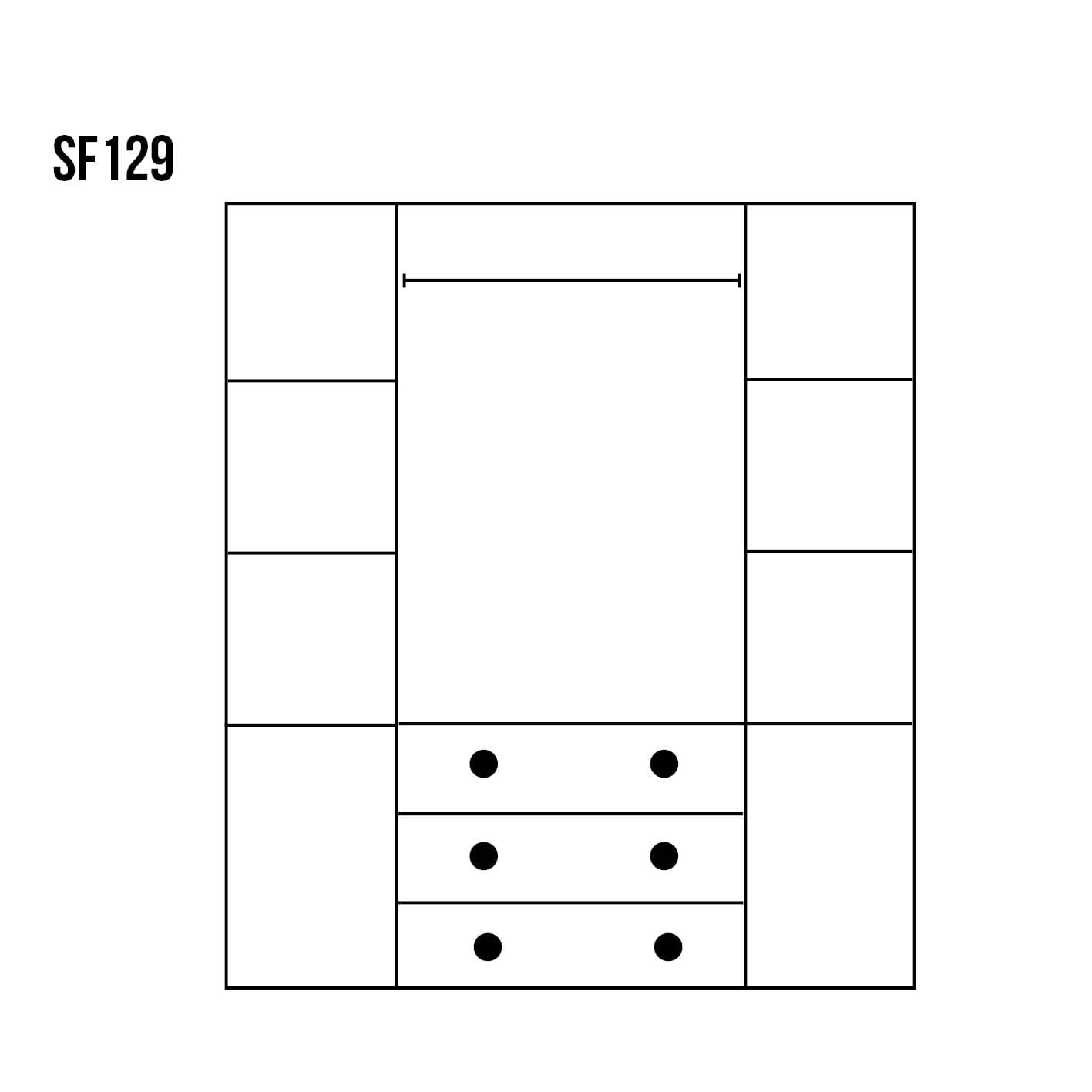 SF129 to sosnowa szafa, w której zmieścisz całą swoją garderobę. Pojemna i nowoczesna będzie jednocześnie ozdobą i funkcjonalnym elementem wnętrza. Szafa została podzielona na dwa segmenty. W jej bocznych częściach zaprojektowano symetrycznie rozmieszczone półki, a w środkowej drążek na wieszaki. Trzy pojemne szuflady umiejscowione w dolnej części szafy sprawdzą się do przechowywania rzadziej używanych rzeczy.