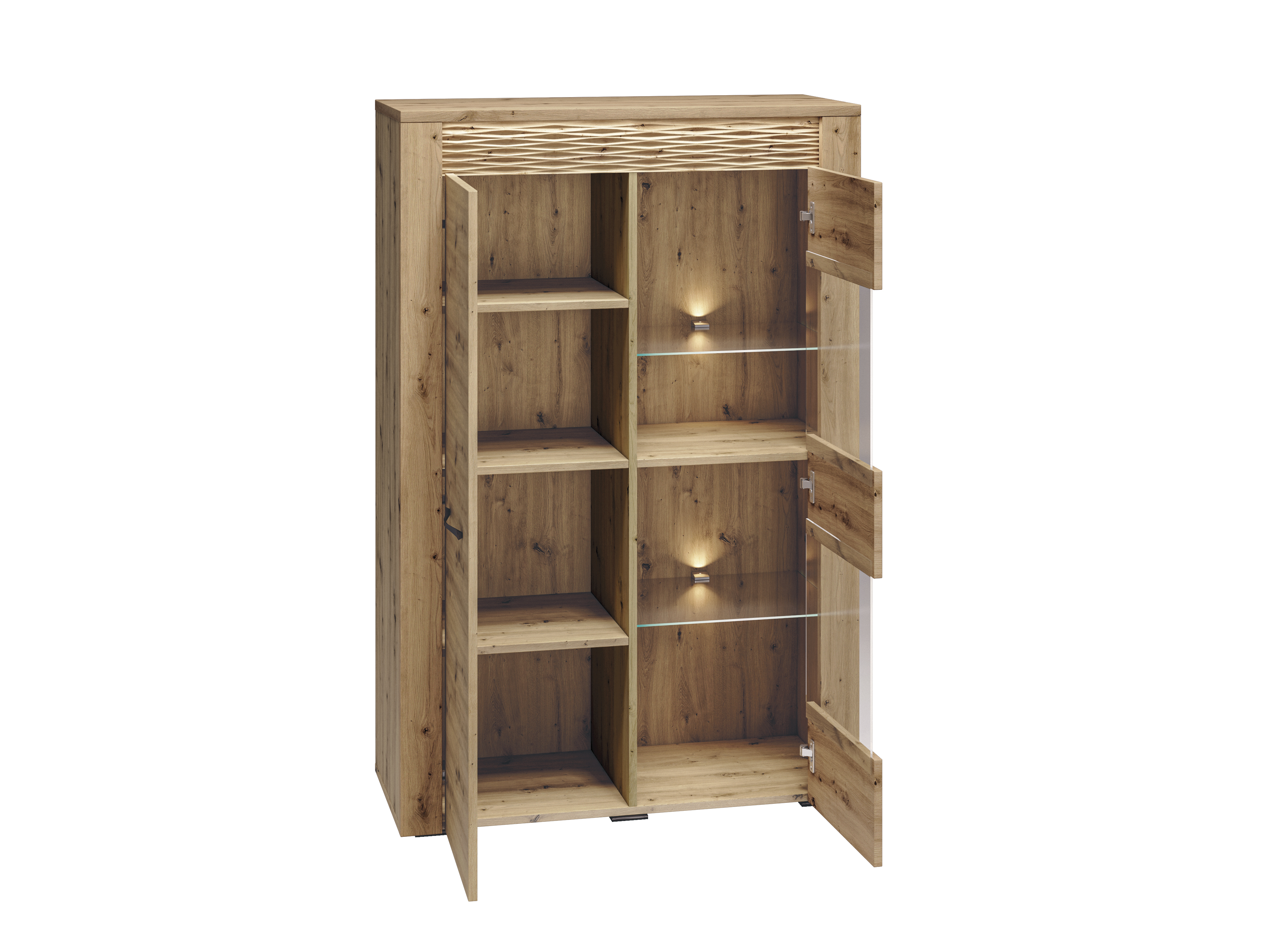 W standardzie podświetlane są dekoracyjne elementy, a opcjonalnie dostępne jest również podświetlenie szklanych półek, które dodatkowo podkreśla zawartość mebla i buduje nastrojowe oświetlenie we wnętrzu.