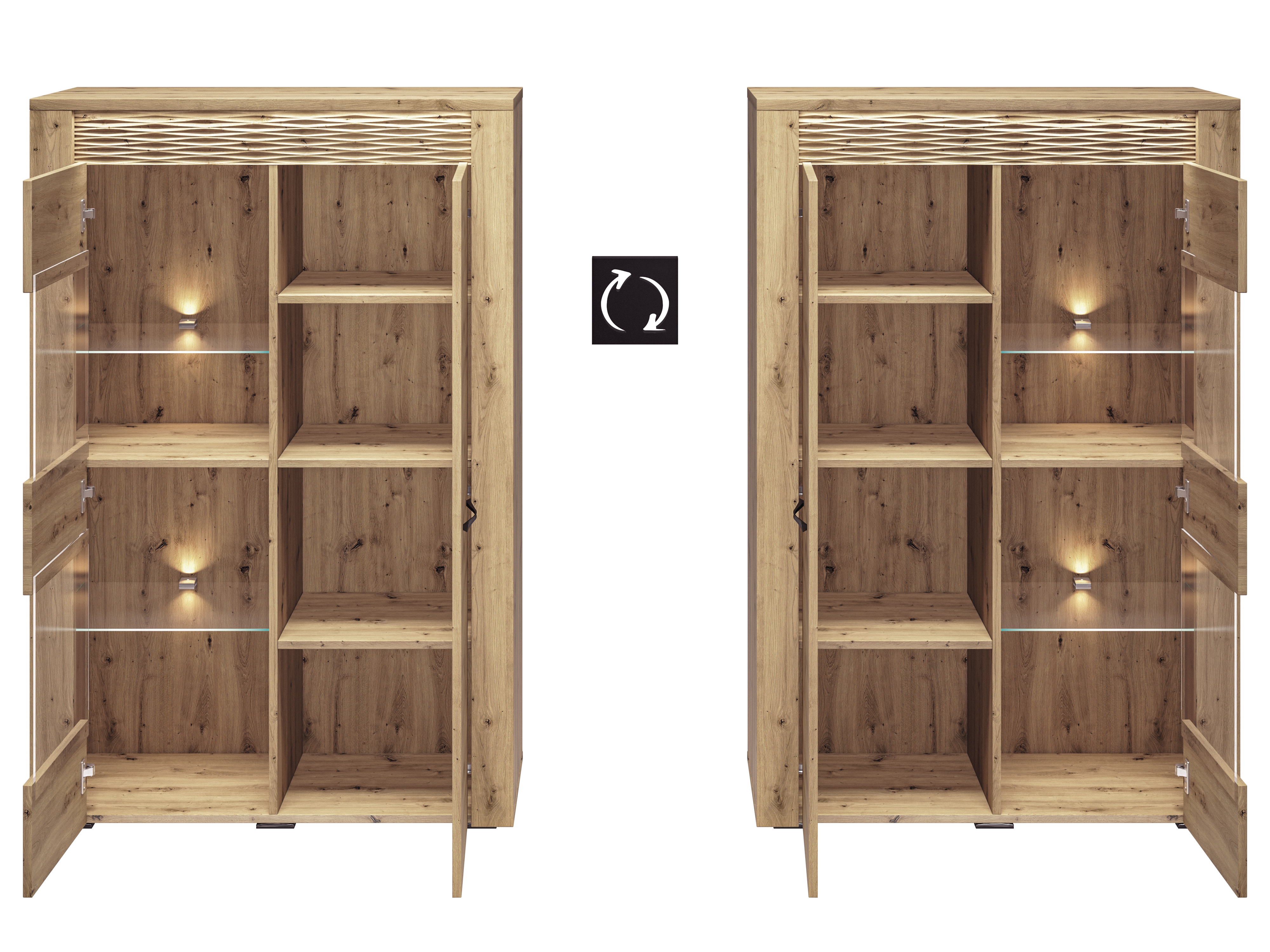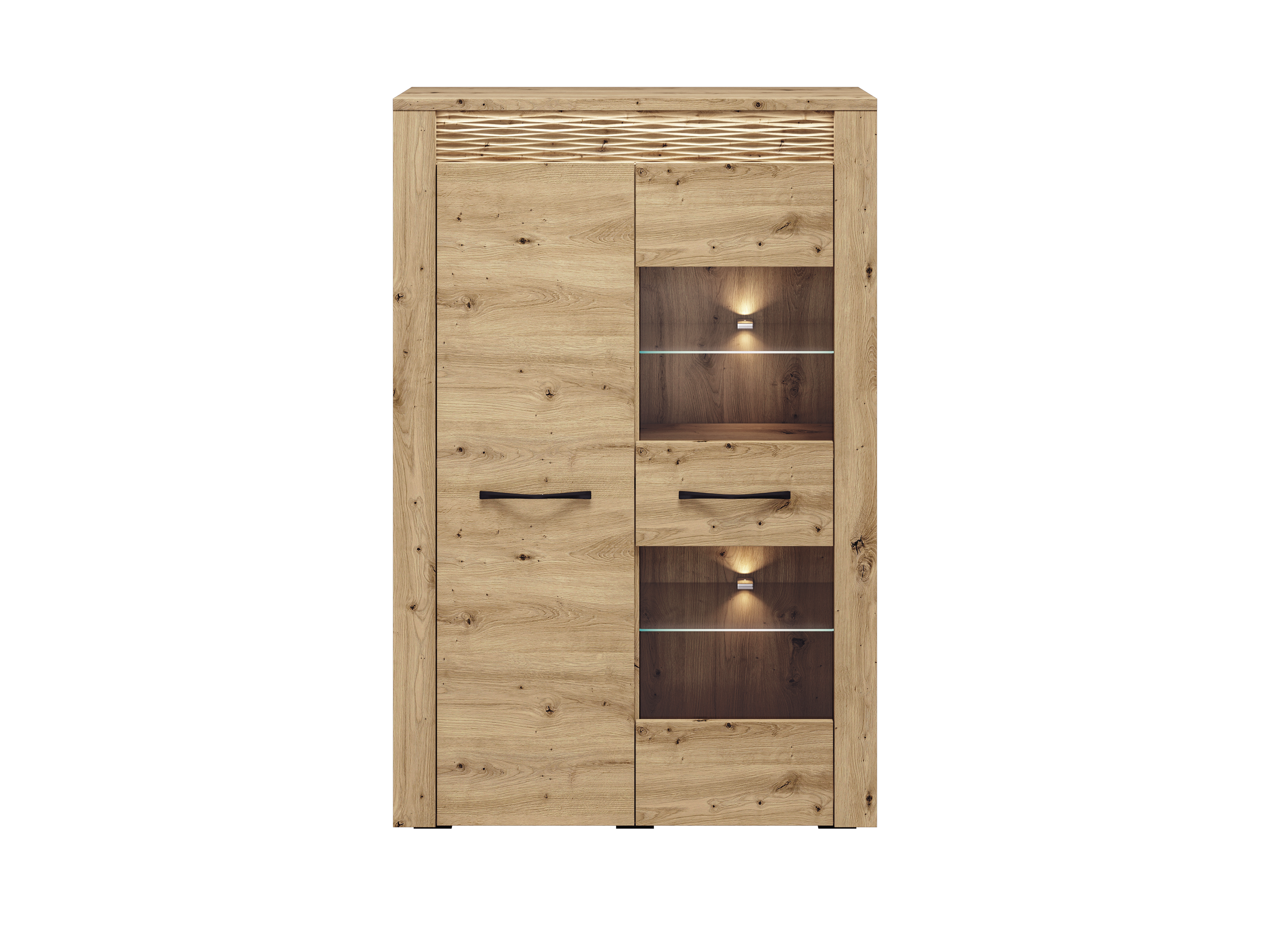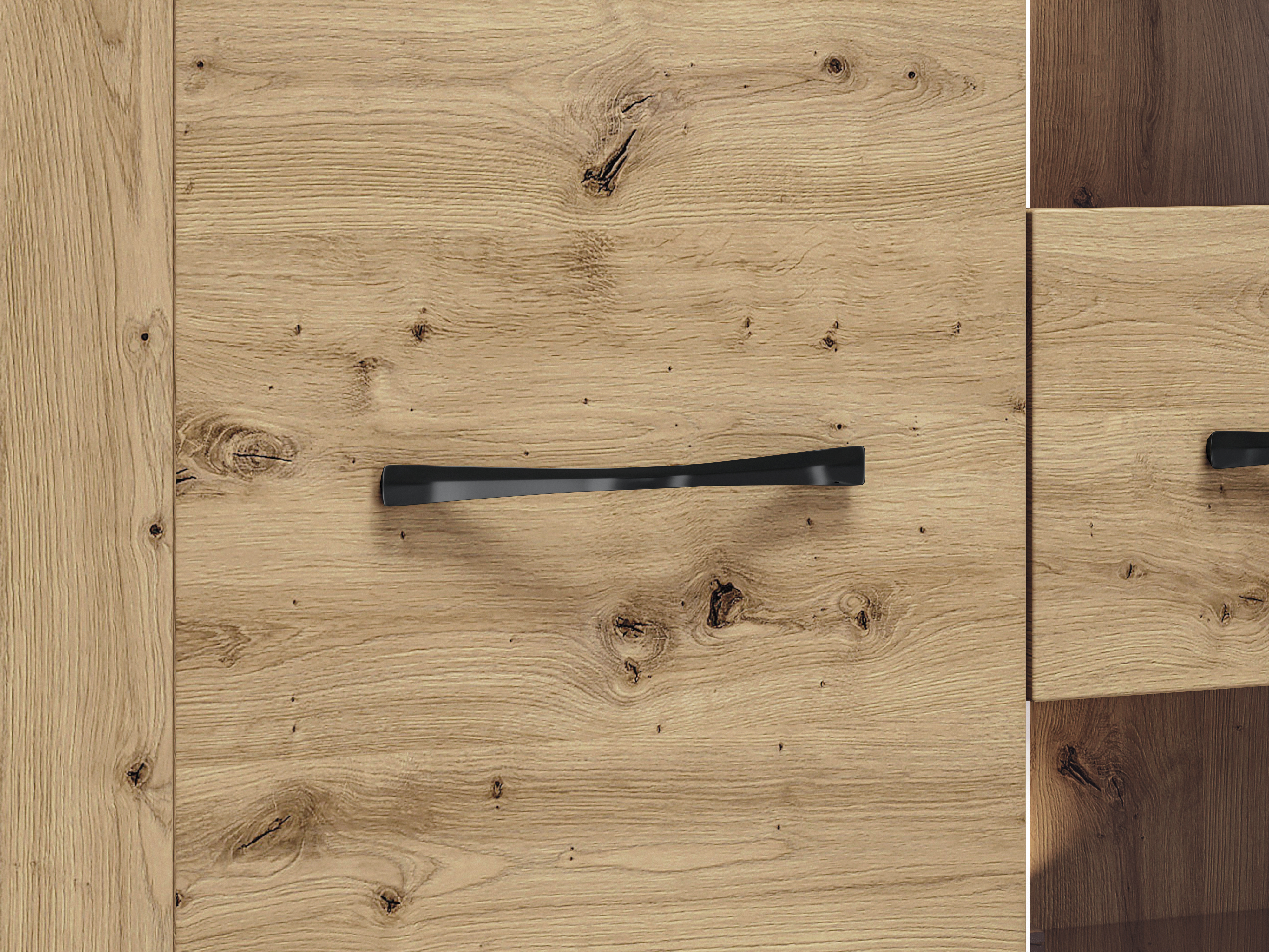 Witryna ARTIS łączy naturalne piękno drewna z nowoczesnym designem. Dekor dębu z widocznym usłojeniem i sękami tworzy ciepłą, przytulną bazę, którą uzupełniają kontrastujące czarne uchwyty o eleganckim wykończeniu.
