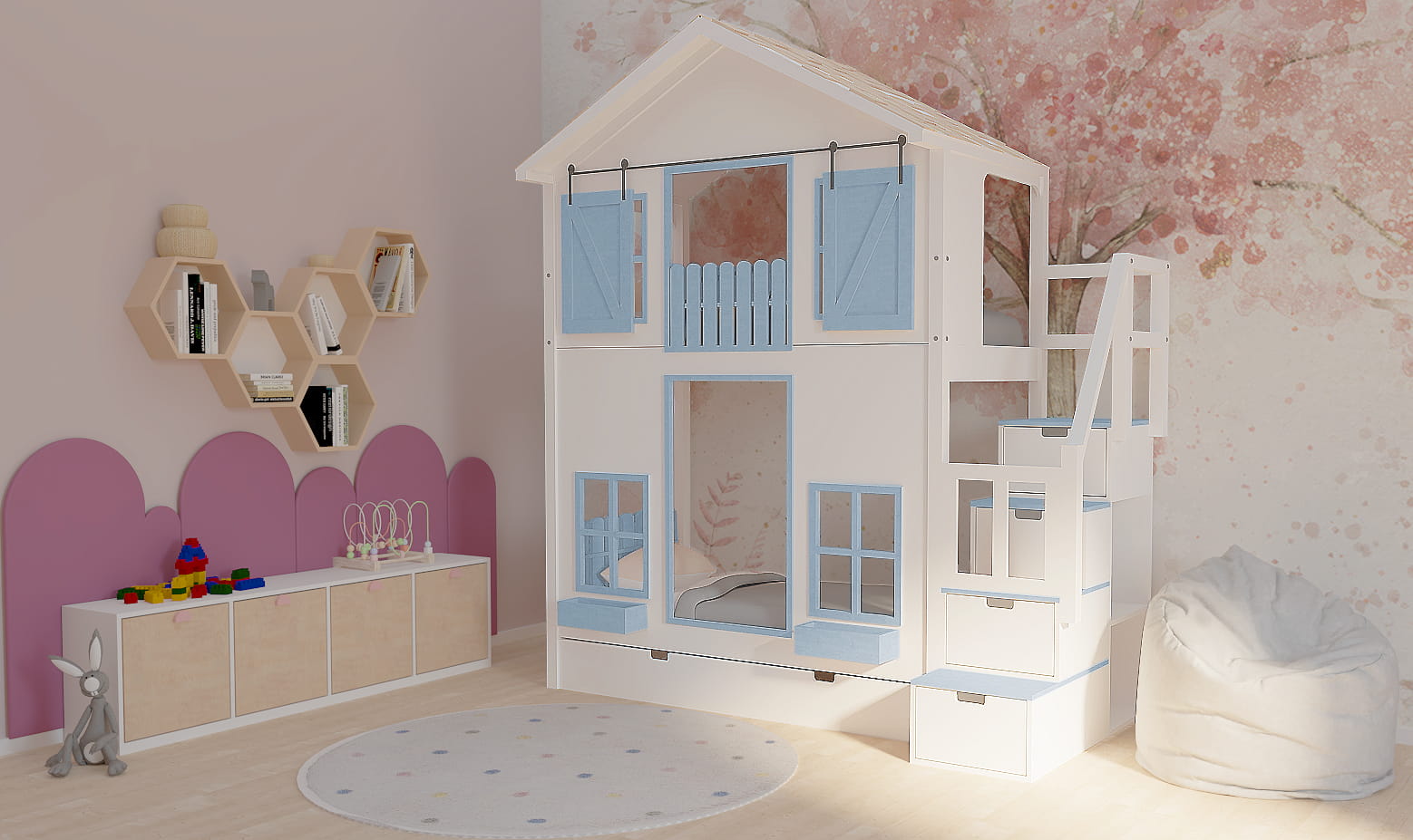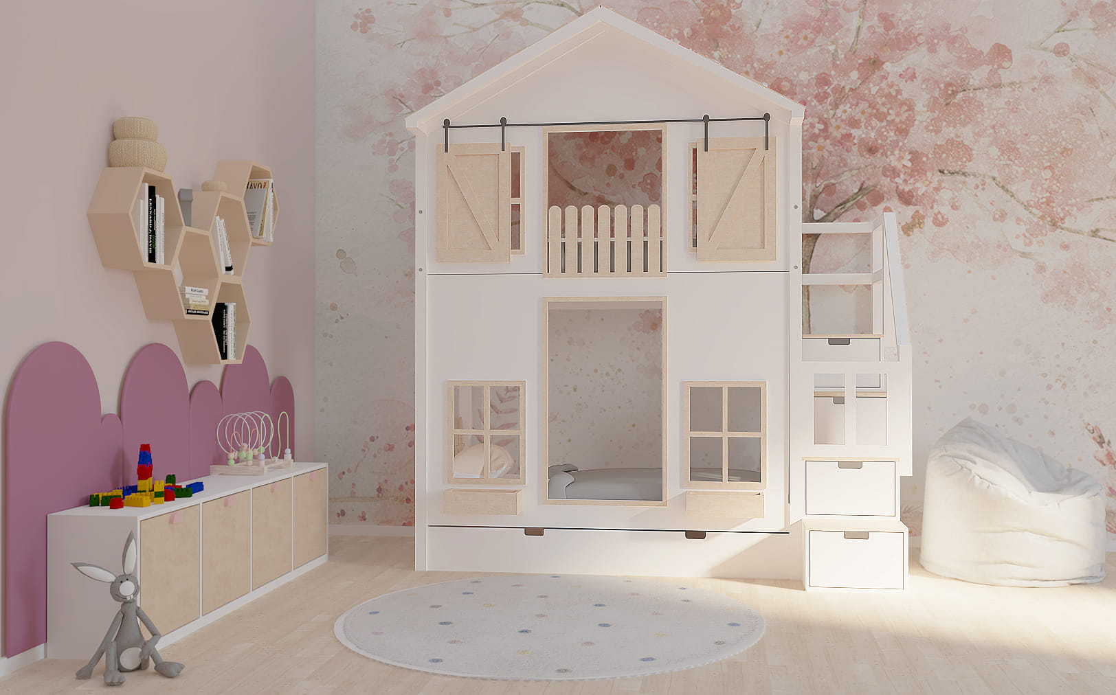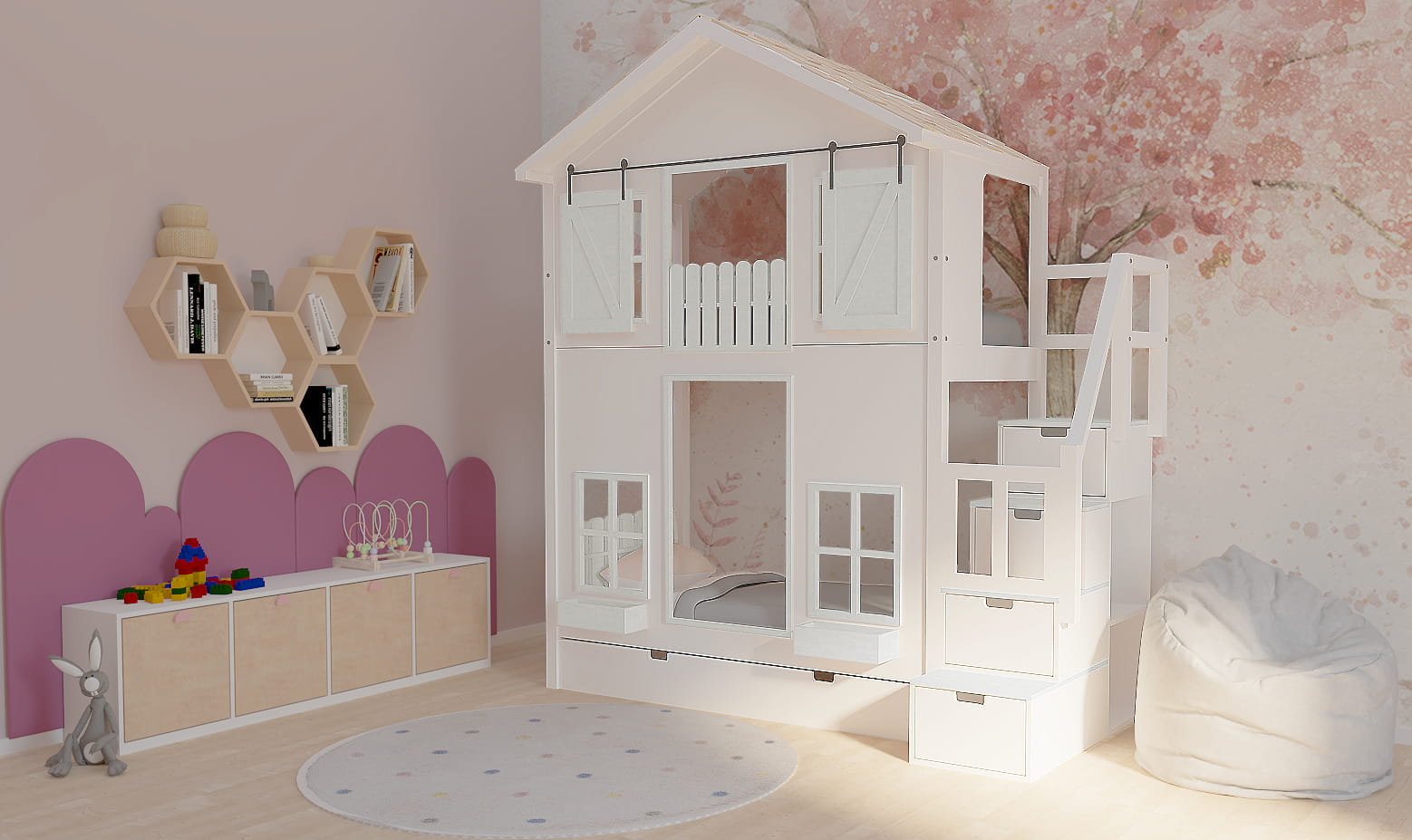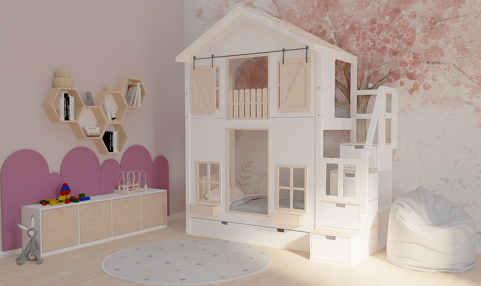 Ten uroczy drewniany mebel w zaczarowany sposób zmieni dziecięcy pokój stając się centrum wypoczynku oraz zabaw. Istnieje możliwość dopasowania go do Waszego stylu. Dzieci będą zachwycone.