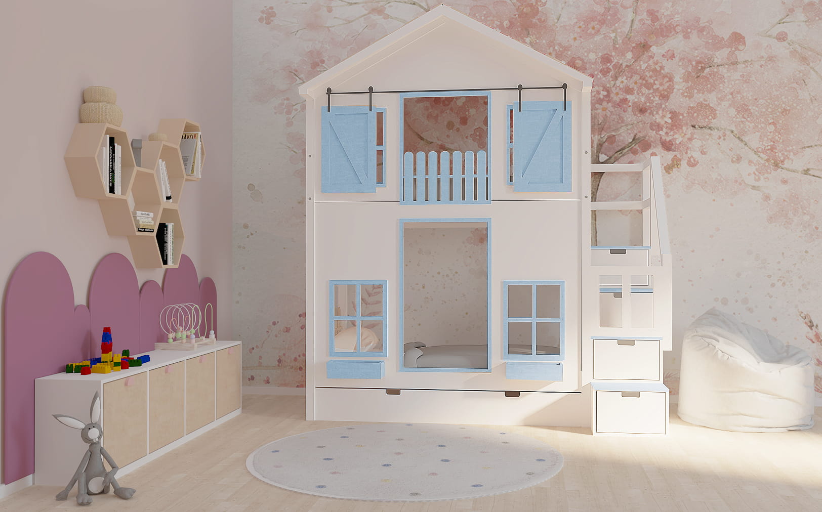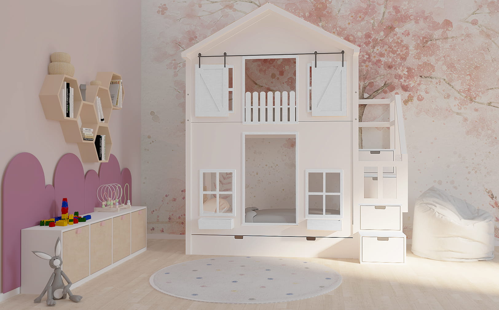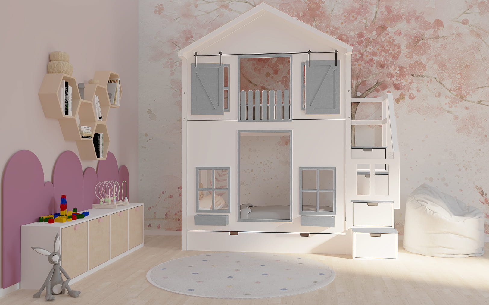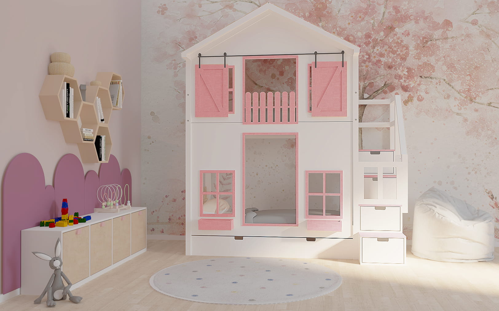 Ten uroczy drewniany mebel w zaczarowany sposób zmieni dziecięcy pokój stając się centrum wypoczynku oraz zabaw. Istnieje możliwość dopasowania go do Waszego stylu. Dzieci będą zachwycone.